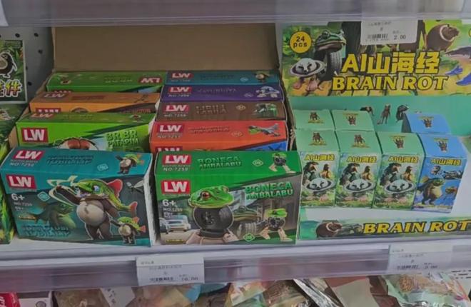 事實上隨着AI山海經的火爆,看到其商業化潛力的人並不少。相關產品早就從線上的段子蔓延到了線下的商品裏,不僅早早有了吧唧、表情包、玩偶的整條穀子產業鏈,甚至連TCG卡牌品牌都已經誕生,慢一拍的國內商超裏也已經能看到相關玩具。