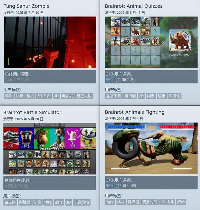 這些遊戲的標題大多帶有“腦腐”關鍵字,遊戲裏都會出現相關的爛梗合成獸,一些是原創,一些則是引用互聯網上已經比較受歡迎的那些,但總之一眼就能看出其形象是用AI生成的。至於玩法,則各不相同。