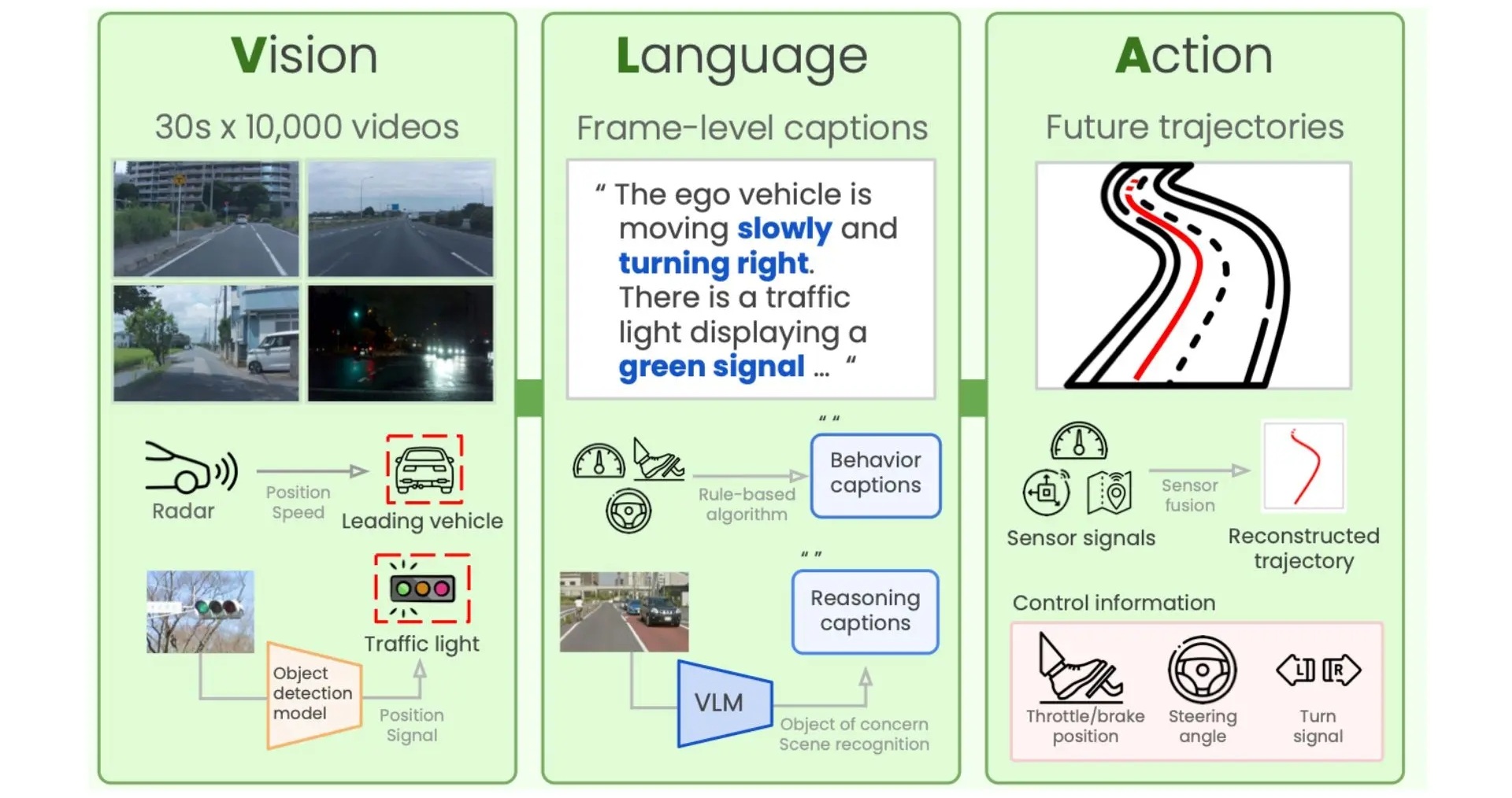 VLA作為一種融合了視覺(Vision)、語言(Language)和操作決策(Action)的多模態大模型,是介於傳統模塊化和端到端之間的技術架構。它不直接控制車輛,而是先把路況轉化為「語義信息」,比如把感知硬件看到的車道、障礙物、紅綠燈等信息做成語義標註,包括文本描述和視覺關聯,動作生成器綜合視覺和語義信息輸出決策。