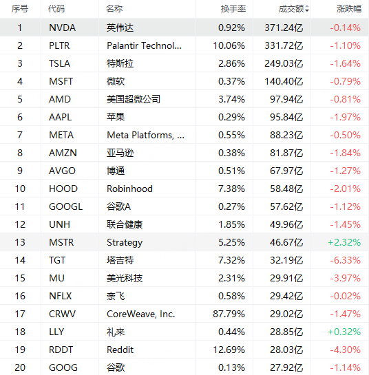 第2名Palantir收跌1.10%,成交331.17億美元。該股已經連續6個交易日下跌,累計跌幅達16.56%。
