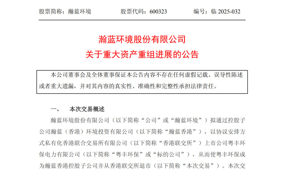 這意味着,從2024年7月7日瀚藍環境啓動私有化粵豐環保開始,為期近一年的百億併購事件終於落幕,該事件也被視為環保產業存量整合時代開啓的標誌。