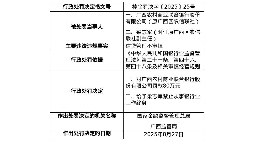 罰單顯示,廣西農村商業聯合銀行股份有限公司的主要違法違規事實爲:信貸管理不審慎。