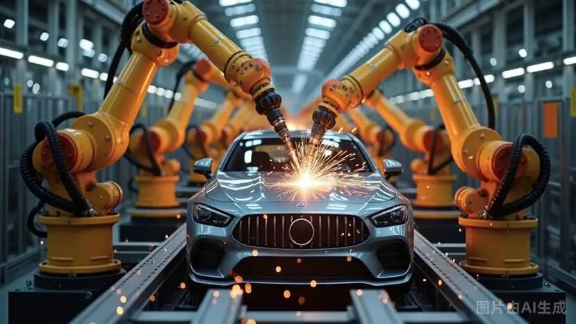 以及,「一條高度精密的汽車生產線,無數機械臂在協同工作,焊接時火花四濺,充滿工業美感。」
