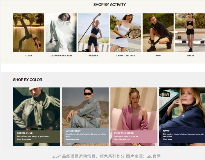 alo本身定位更像個傳播生活方式的時尚品牌,並不侷限於單一運動場景,瑜伽、普拉提、網球、力量訓練等多種運動場景均有所佈局。