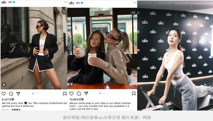 明星效應的放大鏡作用下,alo成功營造出一種健康、活力、時髦的精緻形象,讓消費者無形中形成「穿上alo,我也自律又健康、精緻又鬆弛」的認知。