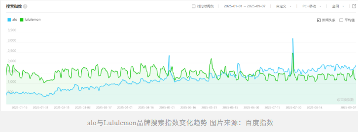 對比Lululemon與alo品牌搜索指數,2025年上半年Lululemon維持平穩勢態,alo持續增長,於5月首次超過Lululemon品牌熱度,7月正式開啓了熱度碾壓Lululemon的局面。