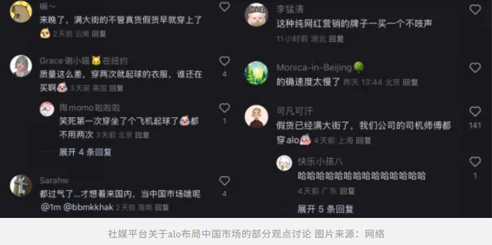假貨氾濫帶來的影響不僅是渠道佈局側,更是撕碎了alo一直以來營造的精緻品牌人設。