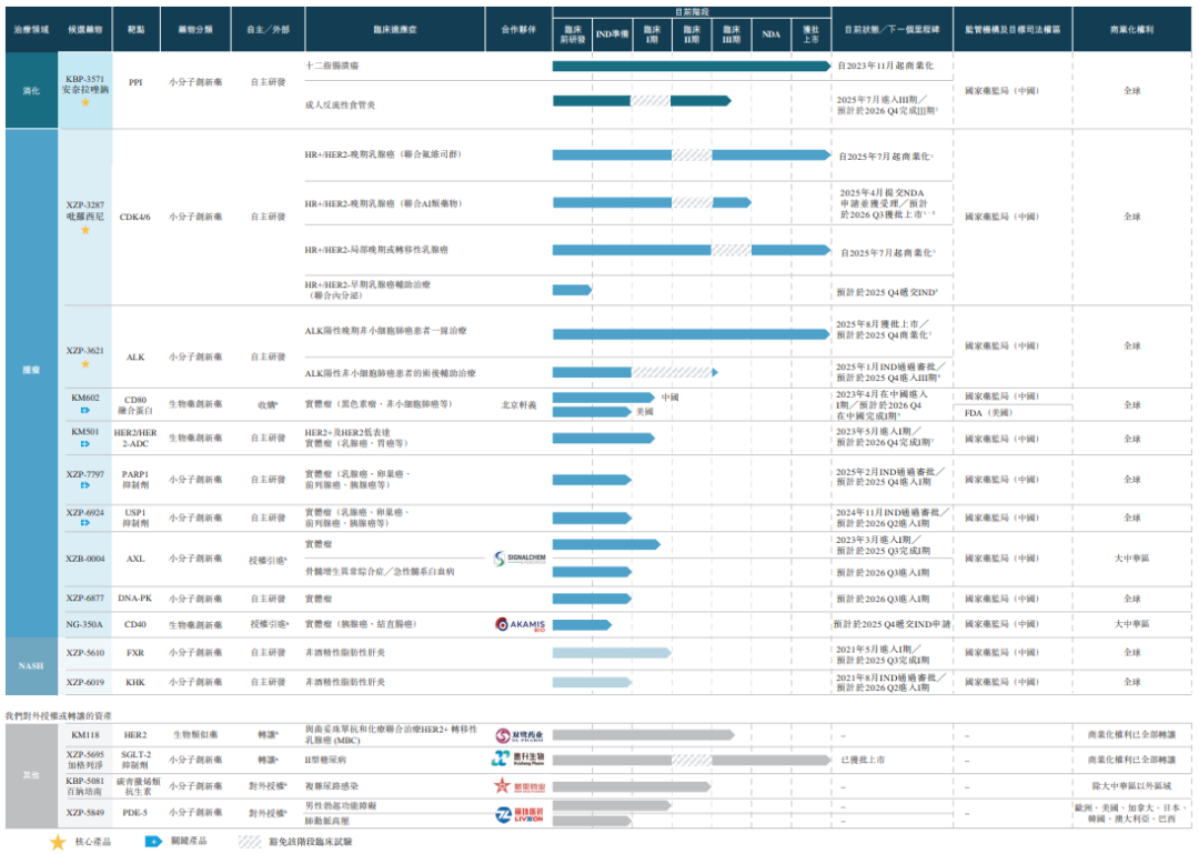 在公司的管線中,公司有三款核心產品,即KBP-3571(已獲NDA批准的治療消化系統疾病的創新質子泵抑制劑(PPI))、XZP-3287(已獲NDA批准的靶向乳腺癌的細胞週期蛋白依賴性激酶4/6(CDK4/6)抑制劑)和XZP-3621(已獲NDA批准的靶向非小細胞肺癌(NSCLC)的間變性淋巴瘤激酶(ALK)抑制劑)。