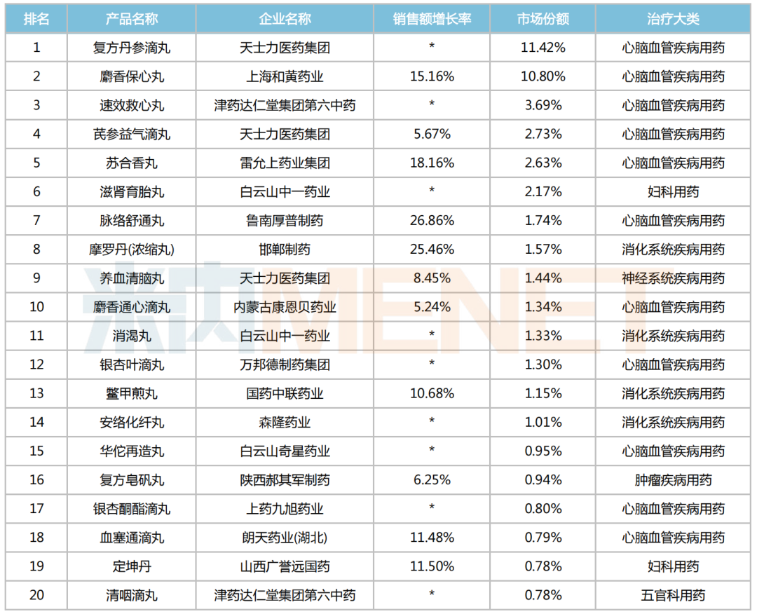 從治療大類上看,20箇中成藥丸劑覆蓋六大疾病領域,其中心腦血管疾病用藥佔據主導,有11個品牌上榜;消化系統疾病用藥、婦科用藥分別佔4個和2個席位;神經系統疾病用藥、腫瘤疾病用藥、五官科用藥則各有1個品牌在列。