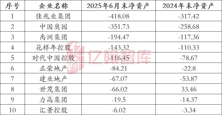 淨資產TOP100榜單之外,則是一片狼藉。佳兆業集團(-418.08億元)、中國奧園(-351.73億元)、禹洲集團(-194.47億元)等企業深陷“負淨資產”困境,意味着其資不抵債的程度相當嚴峻。其中,世茂集團從2024年末的正淨資產33.46億元,惡化至負淨資產-66.02億元,凸顯了部分企業風險的加速暴露。