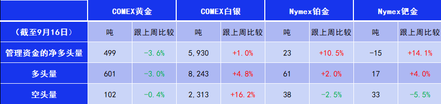 美期黃金基金多頭上週環比跌3% ;基金空頭同時跌0.4%,結果基金持倉在淨多518噸水平回落至499噸,也是連續第102周基金淨多的情況(再之前是連續46周淨多),亦為2019年9月的歷史最高位908噸的55%。今年至9月16日為止美元金價今年累積40.5% (上週+38.1%),基金多頭同期內累積減少1.4% (上週+1.7%)。