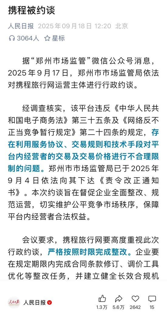 《人民日報》在文章中指出,鄭州市市場監管局已於2025年9月4日依法向其下達《責令改正通知書》,並提出攜程旅行網要高度重視此次行政約談,嚴格按照時限完成整改。