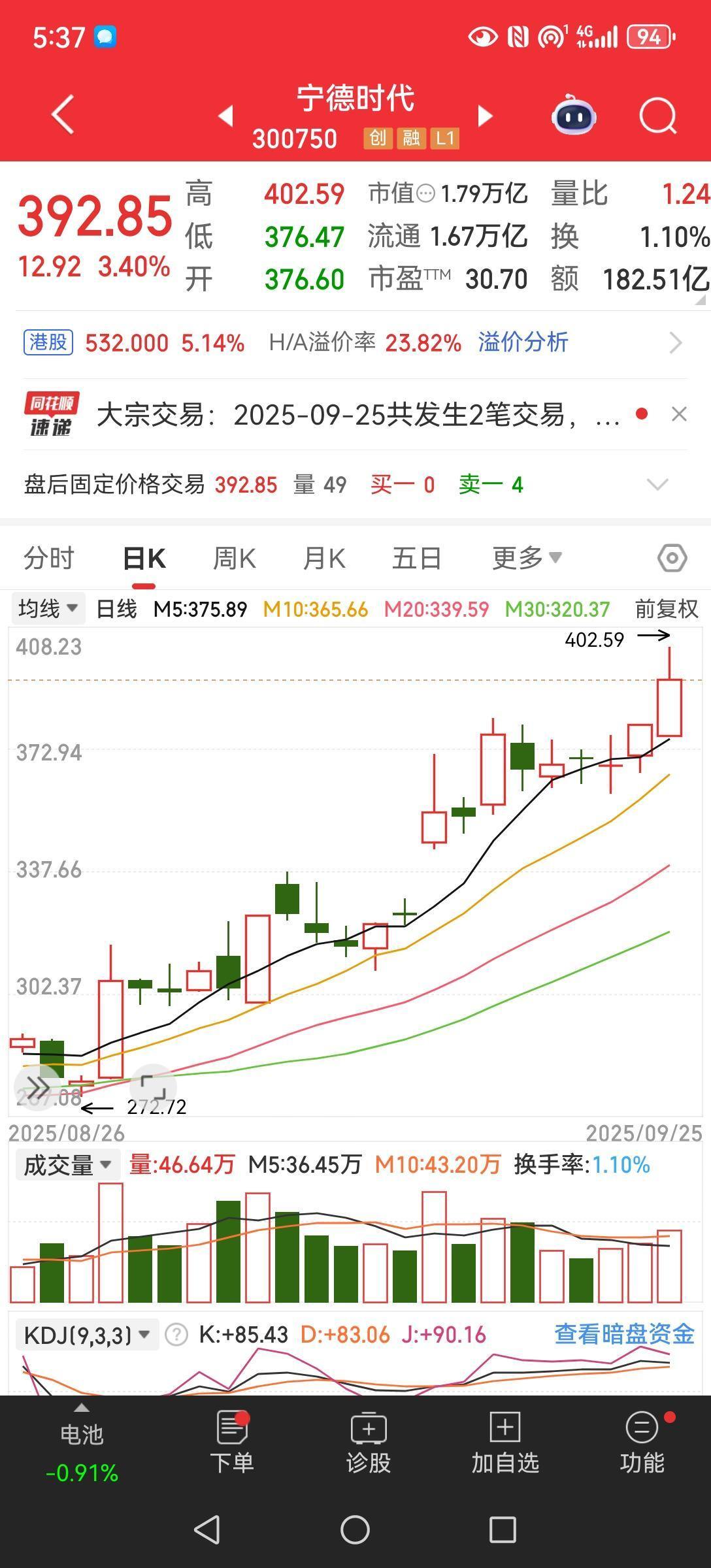 9月25日A股開盤後,科技股龍頭寧德時代股價持續上揚,市值從1.75萬億元一路拉昇,最終在午盤前達到1.80萬億元,A股市值歷史性超越貴州茅臺。到今天收盤,「寧王」股價稍有回落,不過市值離茅臺也僅一步之遙。
