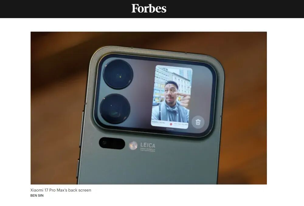 圖注:美國《福布斯》雜誌網站上展示的小米17 Pro Max「妙享背屏」