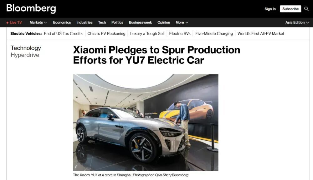 圖注:美國彭博社報道小米YU7加速量產