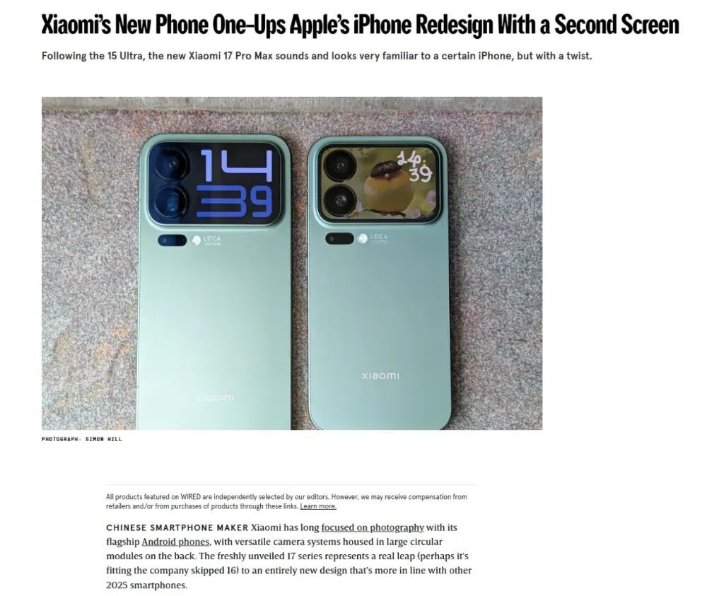 圖注:《連線》雜誌網站報道,報道稱小米背屏是超越蘋果iphone的全新設計