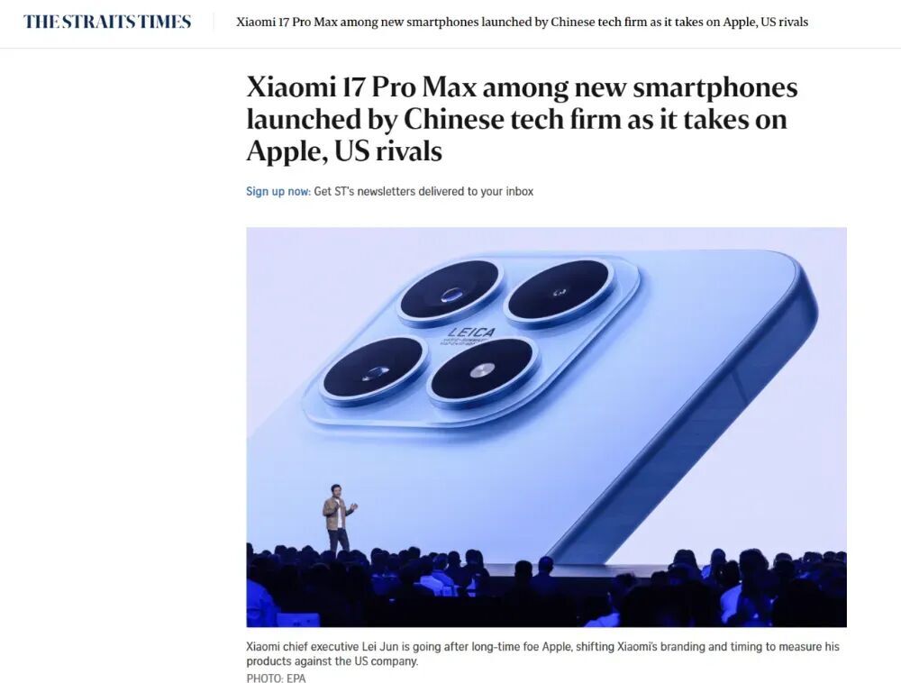 圖注:新加坡《海峽時報》關注小米17系列手機創新,稱其正在與蘋果展開競爭