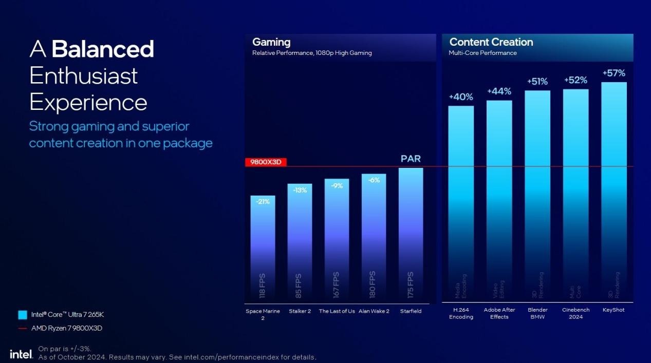 在Ultra7265K對比9800X3D中,英特爾官方意欲證明雖然遊戲性能上Ultra7265K有些許落後,但內容創作方面碾壓了對手:「平衡的表現」、「更強大的遊戲性能和創作性能」,並提供了更為超值的每美元遊戲性能。