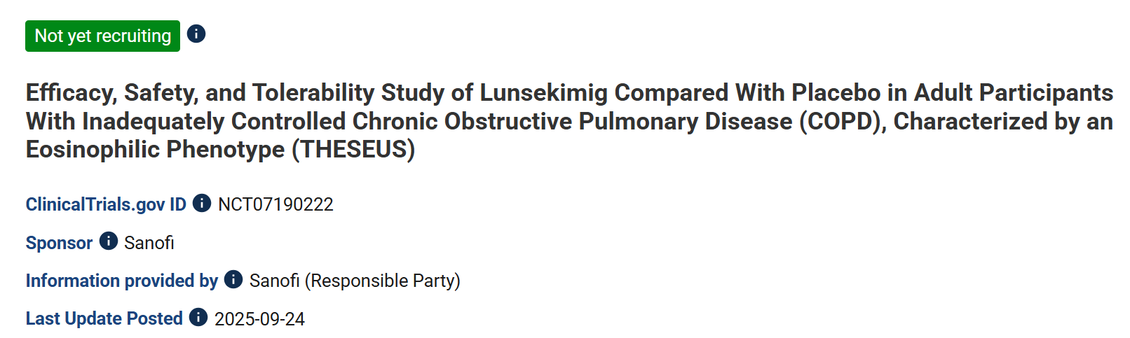 智通財經APP獲悉,9月24日,全球臨牀試驗收錄網站顯示,賽諾菲(SNY.US)的TSLP/IL-13雙抗Lunsekimig(SAR443765)推進至II/III期階段,針對慢性阻塞性肺病(COPD)啓動了兩項II/III期臨牀試驗(THESEUS和PERSEPHONE)。