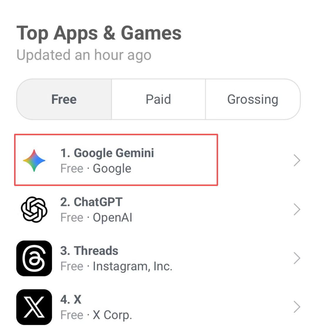 瘋狂的流行帶來了另一個好處,就是直接帶動了Gemini App的用戶增長。在短時間內,Nano Banana為Gemini App帶來了超過1000萬新用戶。而在前不久,Nano Banana更是幫助谷歌Gemini超越了霸榜蘋果應用榜很久的ChatGPT。