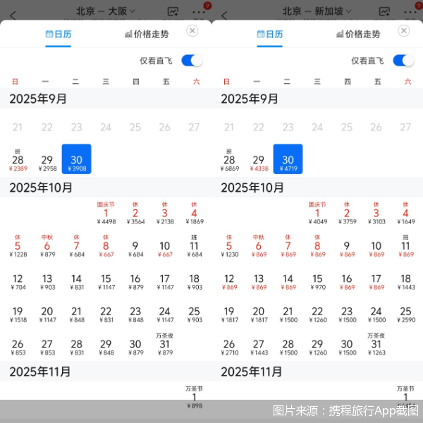 在價格方面,北京商報記者在攜程旅行App查詢看到,出行高峯期的機票價格高漲。北京—新加坡9月30日的最低票價為4719元(不含稅,下同),北京—大阪航線10月1日的最低票價已漲至4498元。