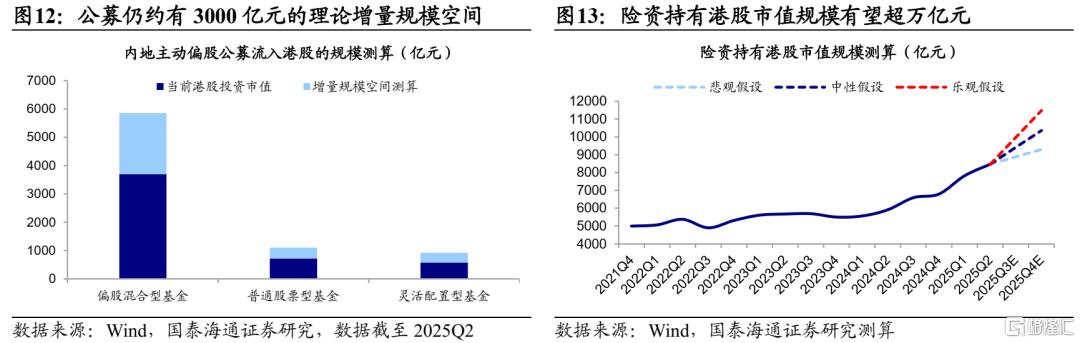 另一方面,外資超預期迴流疊加南向資金持續流入,強化港股增量資金市場。外資方面,過去幾年外資持續流出港股,今年年中港股外資已出現階段性改善趨勢,9月聯儲局議息會議降息25bp,市場預期年內仍有兩次降息,伴隨流動性環境轉松以及中美貿易關係繼續趨穩,外資延續企穩改善或有望超預期。內資方面,港股科技、消費類等相較A股更稀缺的資產在當前宏觀偏弱環境下仍具備較強吸引力,截至2025/9/26,今年以來南向資金已累計流入超1萬億元,未來在主動公募、險資等機構力量推動下年內南向資金或仍有一定增量空間,同樣推動港股行情向上。