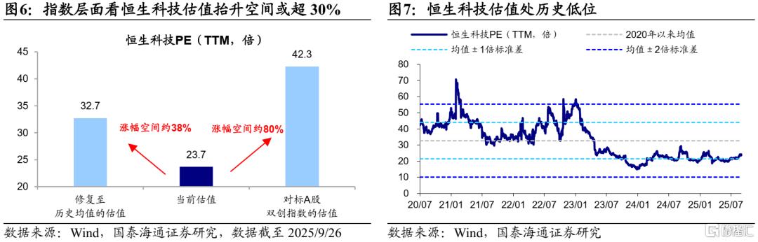 首先從指數自身角度來看,截至2025/9/26,當前恒生科技PE(TTM)為23.7倍,處2020年有數據以來由低到高33%的中低分位,仍位於歷史均值向下1倍標準差附近,未來若修復到歷史均值的位置(約為33倍左右),漲幅空間約為38%。此外從A股對比視角出發,對標同具備科技屬性的A股雙創指數來看,6月以來A股創業板指、科創50明顯跑贏港股恒生科技,估值抬升的速率更快,截至2025/9/26,兩者PE(TTM)分別為44.2倍、187.3倍,分別處2020年以來由低到高52%、100%的歷史分位,未來恒生科技若修復至A股雙創指數估值分位的均值處(約為42倍左右),漲幅空間約為80%。綜上可見,從指數層面定量估算,若恒生科技指數估值修復至歷史均值的位置或修復至與A股雙創指數估值大致的位置,恒生科技估值抬升空間或超30%。