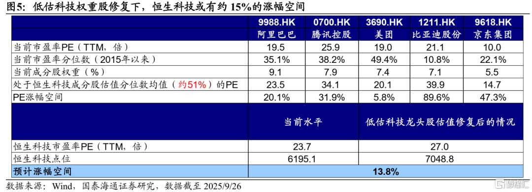 我們從恒生科技主要權重股的角度來定量測算其估值抬升空間,觀察恒生科技前十大權重龍頭股的當前估值分位數情況,發現多數龍頭成分股估值水平仍處歷史中低位置,如阿里(截至2025/9/26,當前市盈率PE為19.5倍、處2015年以來35%的分位水平,下同)、騰訊(25.9倍、38%)、美團(19.0倍、49%)等,估值分位數均低於恒生科技成分股平均水平(約51%)。假設不考慮短期盈利變化及成分股權重變化,經測算,若低估科技龍頭股估值修復至成分股估值分位數均值的位置,未來或能推動恒生科技指數上漲約15%左右。