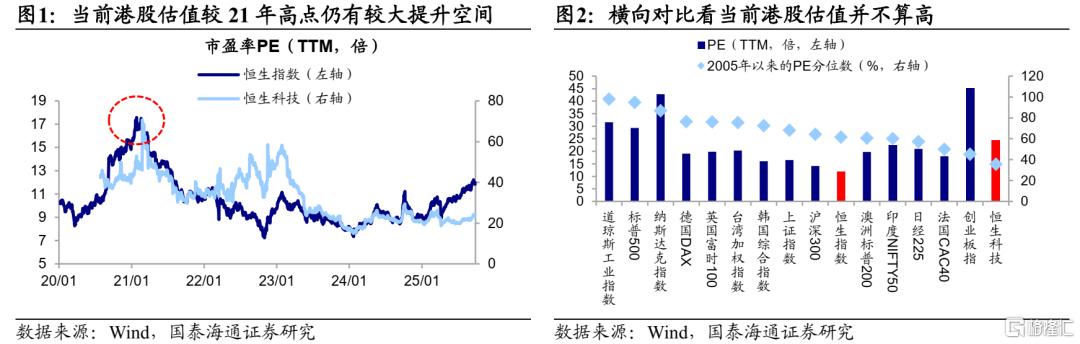 當前港股估值並不高,恒生科技性價比或更優。港股市場自2024年開始企穩回暖,今年一季度和9月以來上漲加速,前期積累的漲幅已經較為可觀,但目前來看無論是從縱向還是橫向比較維度,港股的估值仍然不算高,其中恒生科技的性價比更優。