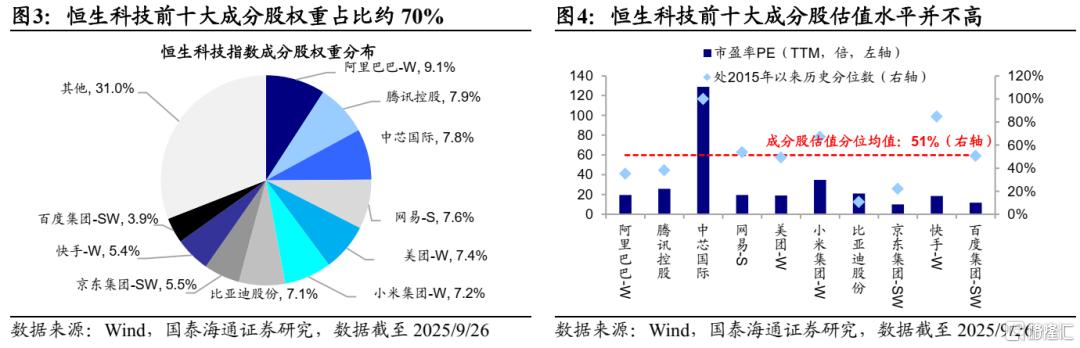 若低估科技龍頭權重股進一步修復,恒生科技或仍有約15%的漲幅空間。分析對比恒生科技指數各成分股的估值情況,我們發現其中的科技龍頭權重股的估值歷史分位水平明顯低於成分股平均水平。恒生科技指數通過流通市值加權編制得到,前十大成分股權重佔比之和約70%,未來若港股互聯網龍頭在AI領域持續進展、其估值由此得到進一步修復,或能明顯推動整體恒生科技指數估值抬升。