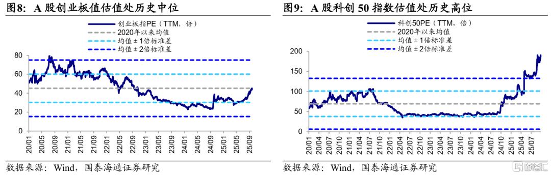 截至2025/9/26,一方面,縱向比較看,當前恒生指數、恒生科技PE(TTM)分別為11.8倍,23.7倍,較兩者2021年估值高點17.6倍、70.7倍仍有較大距離;另一方面,橫向比較看,當前恒生指數、恒生科技PE所處的歷史分位數分別為62%、36%,不僅低於標普500(95%)、德國DAX指數(76%)、英國富時100(76%)等國際主流指數,更低於A股上證指數(68%)、滬深300(64%),其中恒生科技指數估值分位低於創業板指(45%)和科創50(100%),可見以恒生科技等港股資產估值不高。