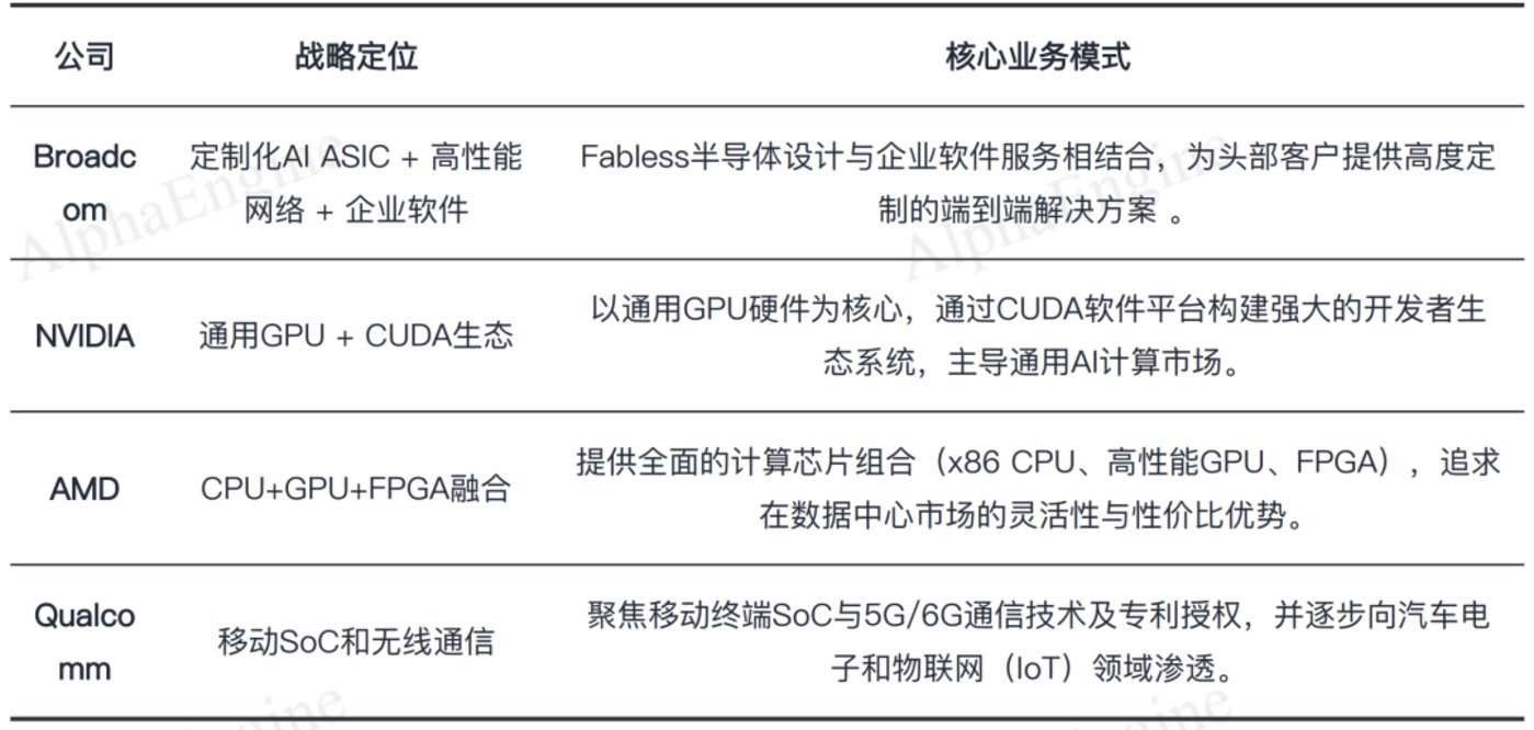 在AI半導體領域,Broadcom與主要競爭對手的戰略定位和業務模式存在顯著差異,形成了各有側重的競爭格局。
