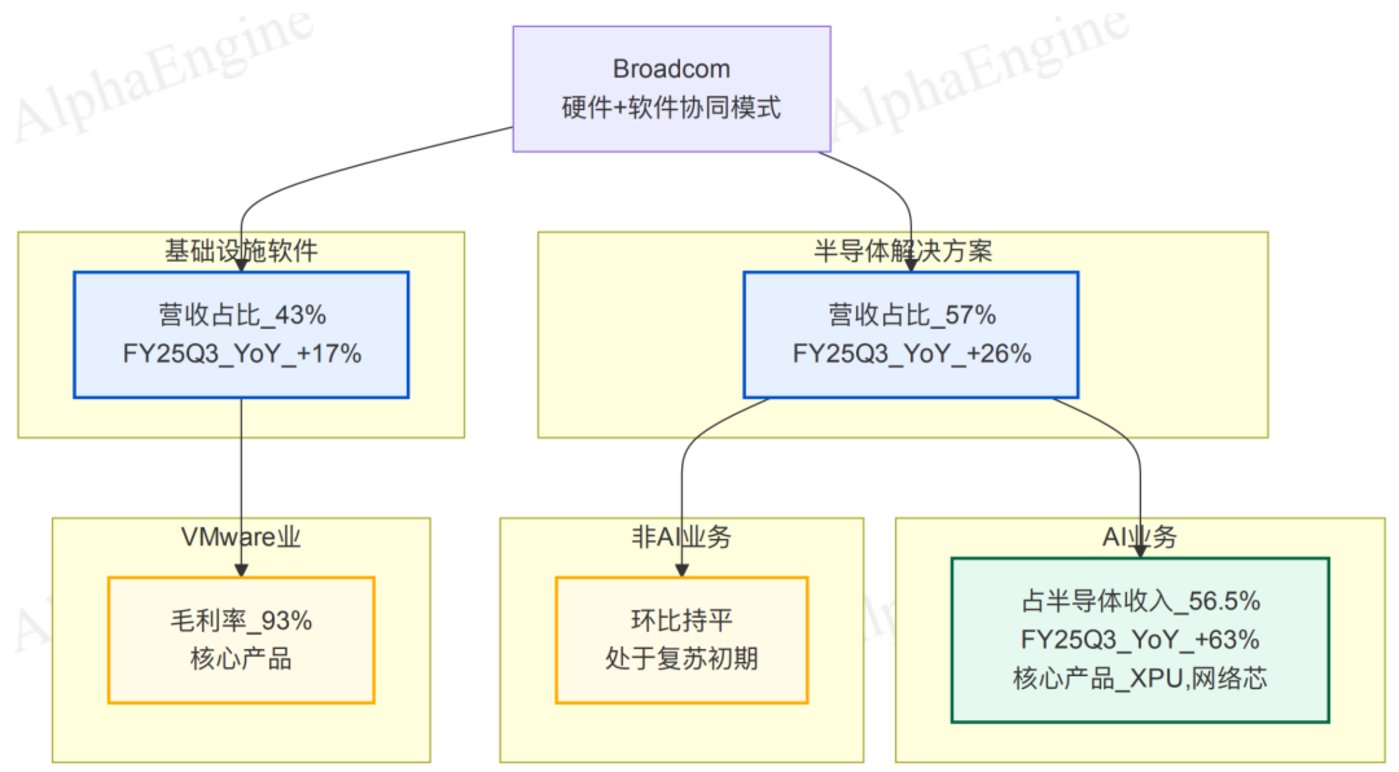 半導體業務(特別是AI定製芯片)提供高增長動力,而基礎設施軟件業務(VMware)則貢獻高達93%的毛利率和穩定的現金流,兩者形成完美互補,平滑了單一業務的週期性風險。