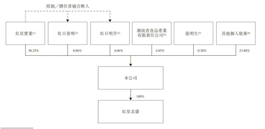 紅星實業亦擔任紅日景明及紅日明升各自的普通合夥人,兩家公司分別控制公司已發行股本總額的8.06%及4.66%,為紅星冷鏈早期股東、業務夥伴及本公司僱員的持股平台。