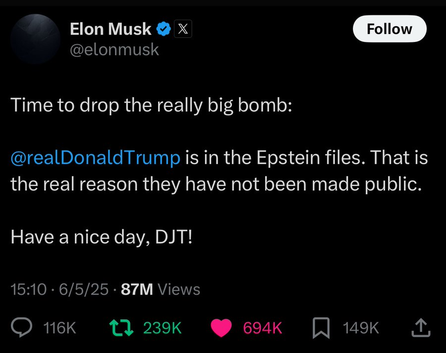 當時,馬斯克還在社交平臺X上爆料稱,「是時候投下真正的重磅炸彈了:特朗普就在愛潑斯坦的檔案裏。這就是這些文件沒有公開的真正原因」,但隨後又刪除了這條帖子。