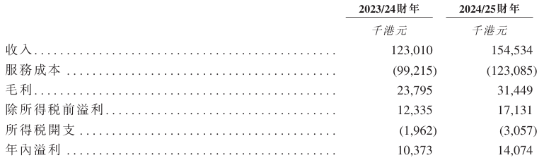財務方面,於2023/24財年、2024/25財年,該公司收入分別約為1.23億、1.55億港元,同期年內溢利分別為1037.3萬、1407.4萬港元。