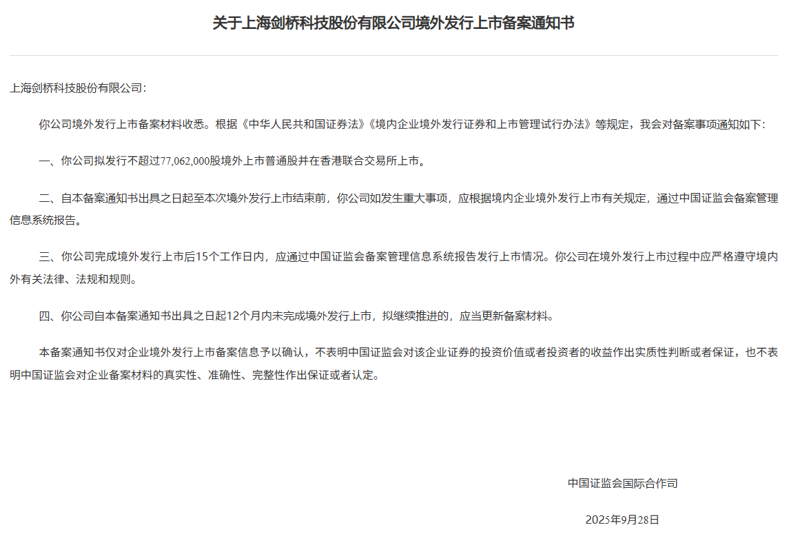 智通財經APP獲悉,9月30日,中國證監會國際合作司發佈《關於上海劍橋科技股份有限公司境外發行上市備案通知書》,劍橋科技(603083.SH)擬發行不超過7706.2萬股境外上市普通股並在香港聯合交易所上市。