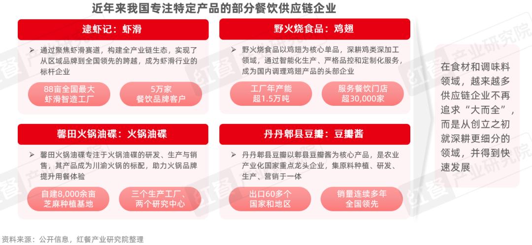 隨着餐飲市場的競爭加劇,餐飲品牌加速調整策略,通過打造「爆品」、精細化運營等形成差異化優勢。在此背景下,餐飲企業的需求越來越多元化,對上游供應鏈企業提出更專業化的要求,如尋求更高品質的產品和定製化的爆品解決方案。這也推動了上游供應鏈的細分化趨勢進一步深化,供應鏈領域不斷湧現出「單打冠軍」。
