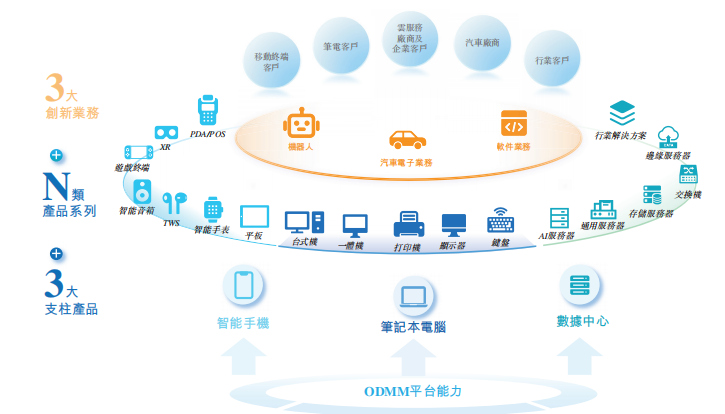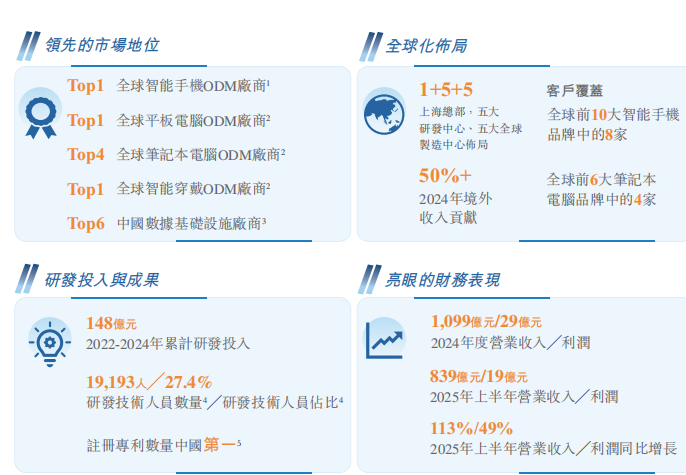 的智能手機ODM廠商;全球第一大的平板計算機ODM廠商和智能穿 戴ODM廠商;全球第四、中國內地第一大的筆記本計算機ODM廠商。