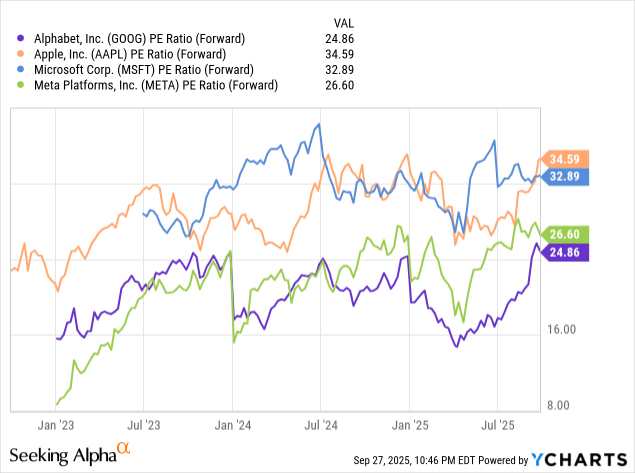 因此,谷歌在大型科技股板塊中始終保持低價。該公司擁有領先的人工智能產品,正在搶佔市場份額,並與其他科技巨頭合作實施,但市場卻不願為其股票支付高昂的價格,卻願意為明年銷售額僅增長5%的蘋果支付高得多的市盈率。