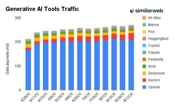 此前,Gemini 應用超越ChatGPT,成為下載量最高的應用。Gemini 持續佔據生成式人工智能流量份額,目前市場份額為 10.8%,而 6 個月前僅為 4.9%。