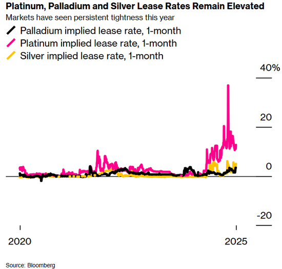 與此同時,其他貴金屬今年遭遇空前供應緊張。隨着數年供應短缺問題集中爆發,倫敦市場可自由流通金屬庫存不斷萎縮引發擔憂。白銀、鉑金和鈀金的租賃利率(反映通常為短期的金屬借貸成本)均已飆遠高於近零的正常水平。