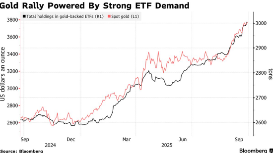今年黃金漲幅已超40%,在央行購金需求與聯儲局重啓降息週期推動下接連創出新高。金價有望實現連續第三個季度上漲,黃金ETF持倉量已達2022年以來最高水平。高盛集團與德意志銀行等機構均預期漲勢將持續。