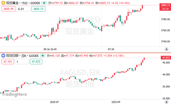 與此同時,現貨白銀日內大漲逾1.00美元,報47.1美元/盎司,漲幅2.2%;鉑金和鈀金同樣強勢上揚,漲勢受到市場持續供應緊張及貴金屬ETF資金流入的支撐。