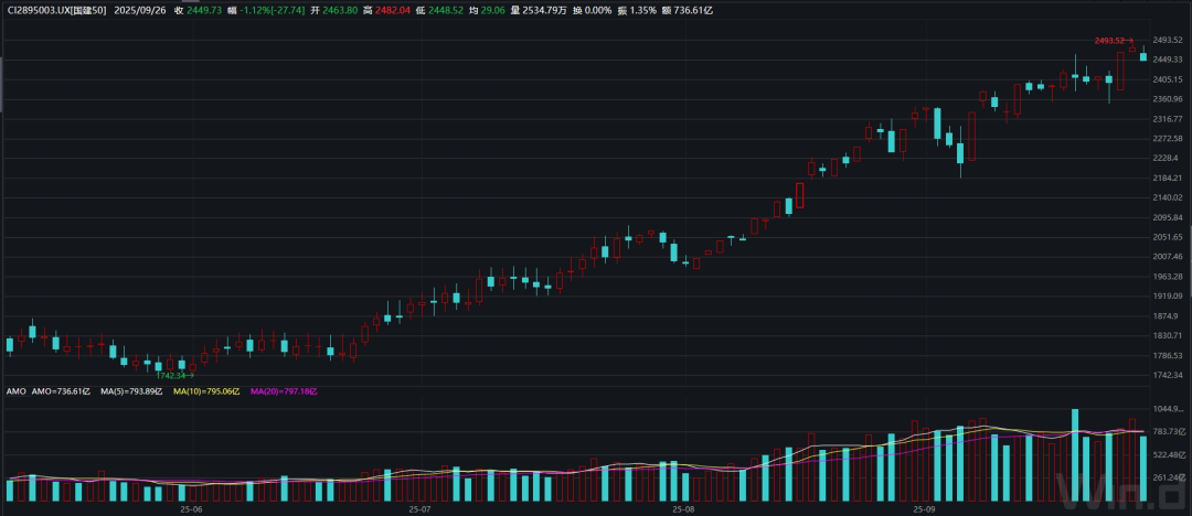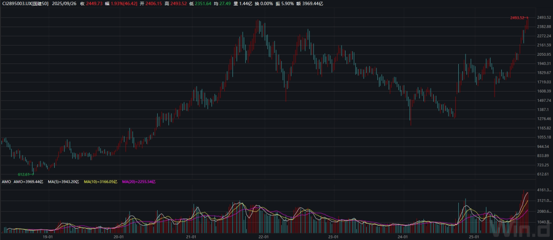 上週「國建50指數」(9月22日-9月26日)開盤2406.15點,收盤2449.73點,周漲幅1.93%,最高2493.52點,最低2351.64點,振幅5.90%,成交金額3969.44億。