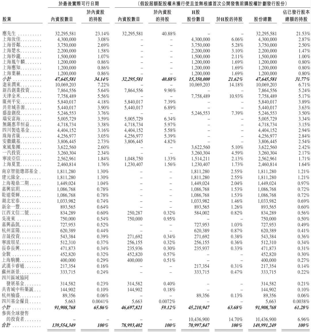 IPO後,應宜倫持股為21.53%,上海汝佳持股為2.87%,上海晉鄰持股為2.5%,上海楚水持股為1.47%,上海妙瀧持股為1%,上海鳳午麟、上海應知、上海葉赫分別持股為0.8%,一共控制31.77%股權。