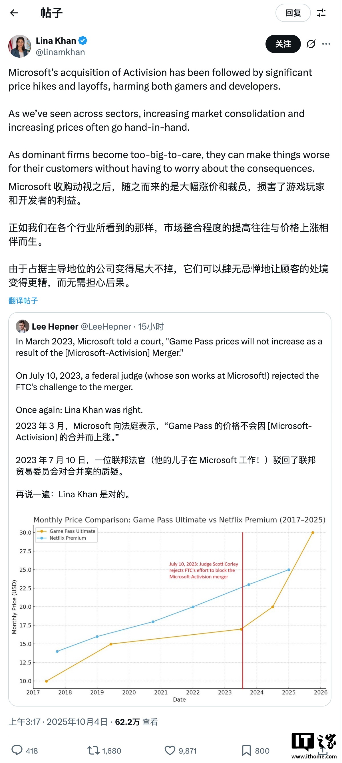 這一帖子回應了一條「再說一遍,莉娜・汗是對的」的評論,評論涉及微軟此前承諾 Game Pass 訂閱費用不會因合併而上漲的說法。