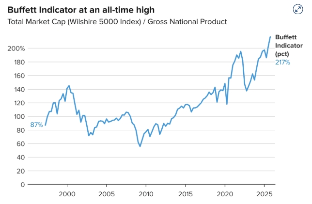 數據顯示,標普500自4月低點以來已反彈近40%,由大型科技公司主導。與此同時,「巴菲特指標」(總市值與GDP之比)已飆升至217%,遠高於互聯網泡沫與2021年新冠疫情期間的高點。巴菲特曾稱該水平是「玩火」。