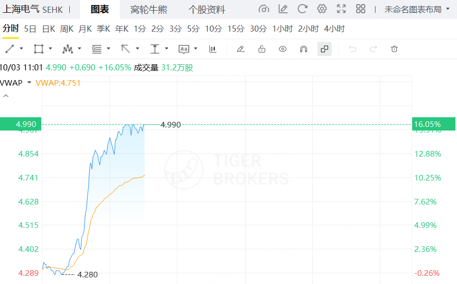 10月3日,上海電氣盤中漲超16%,近一個月股價累漲超四成。