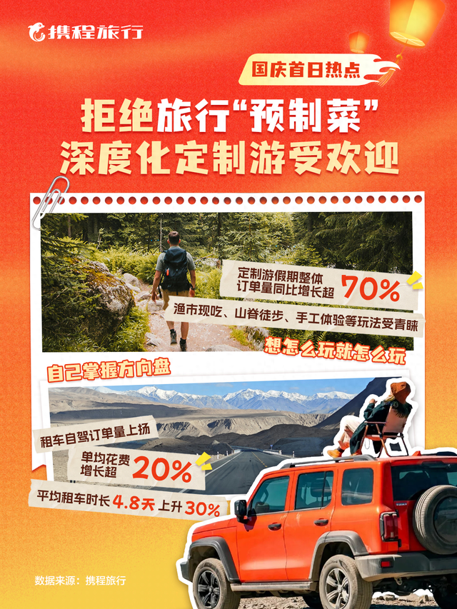 攜程數據印證了這一趨勢。截至目前,國慶期間定製遊銷量同比增長超40%。攜程研究院認為,這一變化反映遊客不再滿足於淺層遊覽,更渴望在旅途中建立情感共鳴與文化理解。